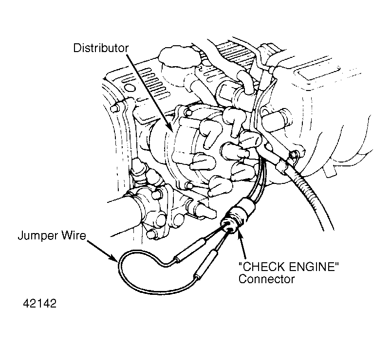 - Turn ignition switch to "ON" position. DO NOT start engine. Using a sub-wire, short terminals T - E1 of "CHECK ENGINE" connector. See Figure.