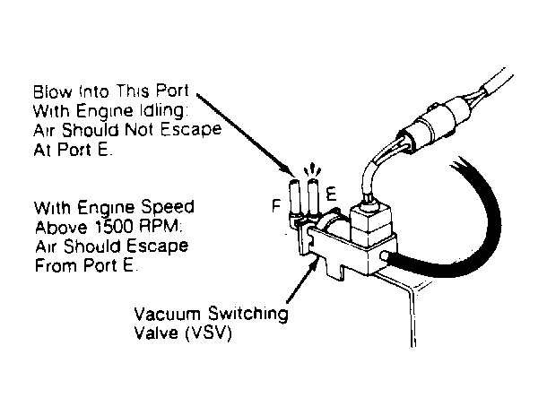 - Check computer control of vacuum switching valve (VSV). Disconnect vacuum hoses from ports "E" and "F" of VSV. See Fig 2. With engine idling, blow into port "F". The valve should close and not allow air to escape through port "E".