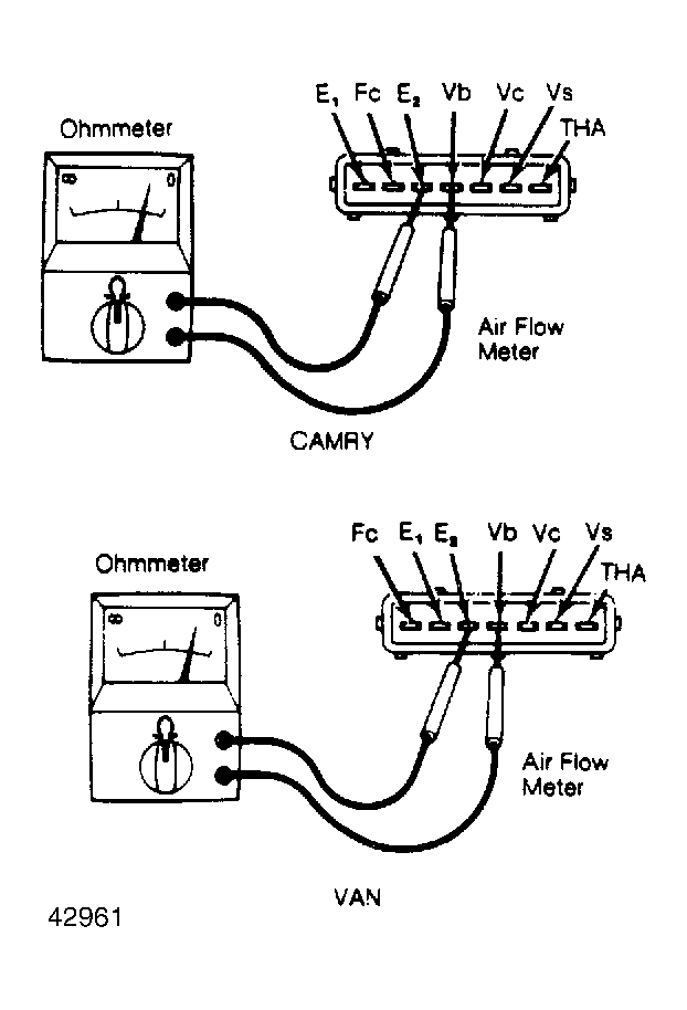 Turn ignition off. Disconnect wiring connector from air flow meter. Using an ohmmeter, measure resistance between each terminal. See Fig 1. If resistance values do not meet specifications shown in chart, replace air flow meter.