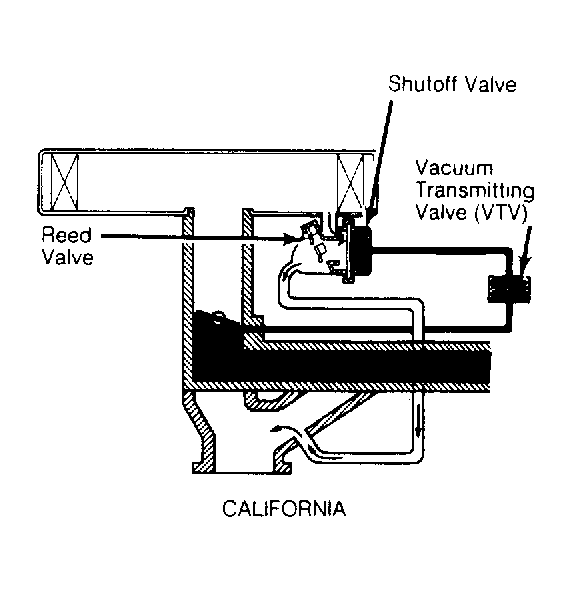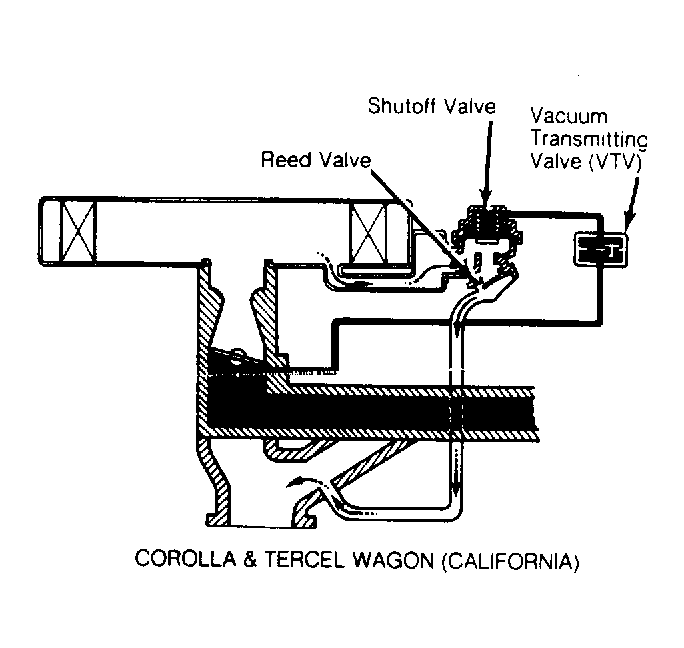 The air suction system on California Corolla, Tercel, and Tercel Wagon models consists of a shutoff valve, a Vacuum Transmitting Valve (VTV), reed valve, and necessary hoses. The Federal Corolla, Tercel, and Tercel Wagon air suction system consists of a reed valve, air filter (if equipped), and hoses. See Figure and Figure .