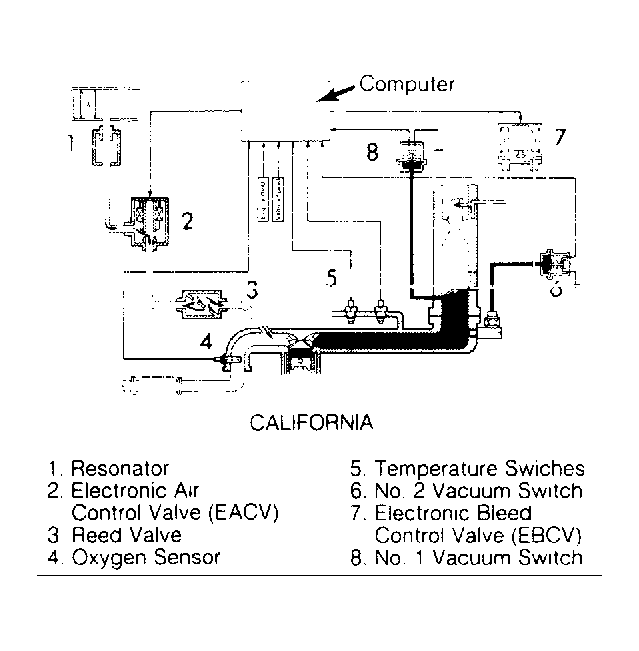 The air suction system on California Pickup and 4Runner models consists of the Computer Controlled Emission (CCE) system computer, 2 temperature switches, 2 vacuum switches, engine RPM sensor, vehicle speed sensor, oxygen sensor, reed valve, electronic air control valve, and resonator. See Figure. Federal Pickup and 4Runner models use a reed valve, Vacuum Control Valve (VCV), Vacuum Transmitting Valve (VTV), Air Switching Valve (ASV), and resonator.