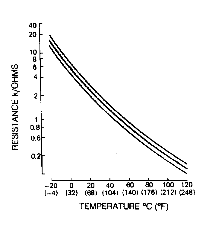 Remove connector from sensor. Using ohmmeter, check resistance between sensor terminals. Replace sensor if resistance is not within specification at specified temperature. See Fig 1.