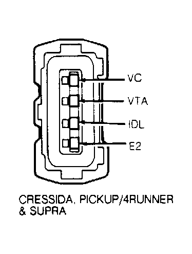 - Connect a tachometer to engine (to monitor needle fluctuations). Start engine and warm to operating temperature. Disconnect throttle position sensor connector from throttle position sensor. Short terminals IDL and E1 (or E2) on wire side of connector. See Fig 1.