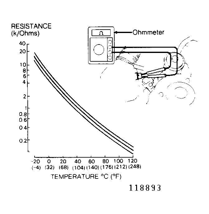 Ensure ignition is off. Unplug air temperature sensor. Measure resistance across air temperature sensor terminals at specified temperature. See Fig 1.