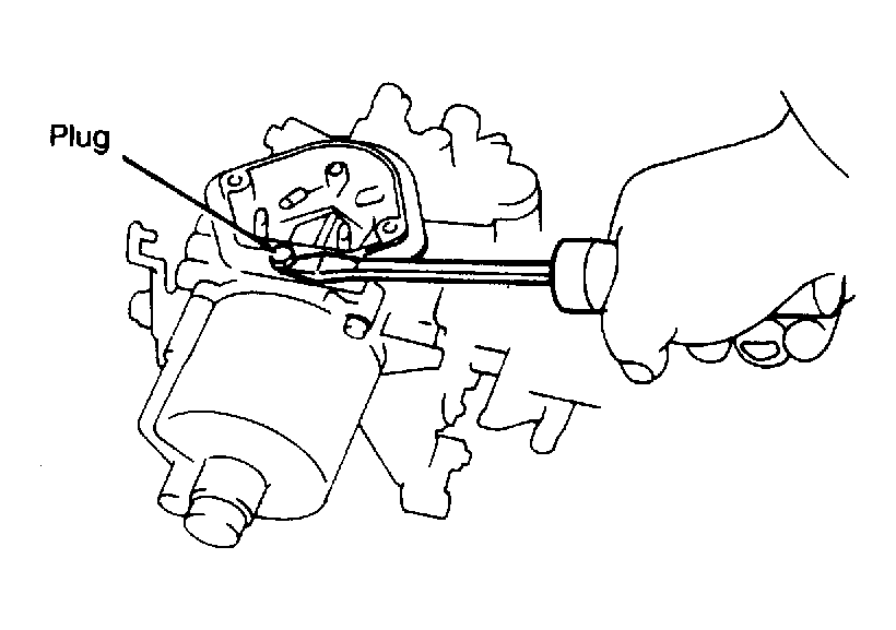 - Install 4 mm bolt into suction chamber adjusting pin plug. Pry off plug with screwdrivers. See Fig 1. Remove "O" ring. Turn over carburetor and shake out pin. Remove 3 screws and pull suction chamber, spring and piston from carburetor body.