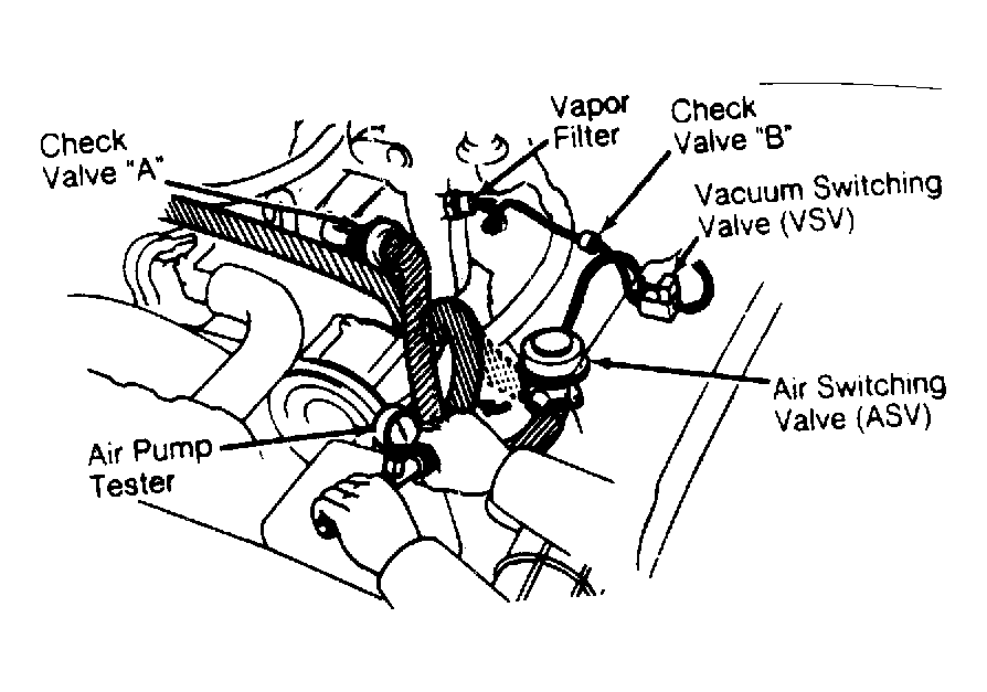 - Inspect air pump belt. Visually check hoses and tubes for kinks, damage or loose connections. Disconnect air by-pass hose from Air Switching Valve (ASV). See Figure.