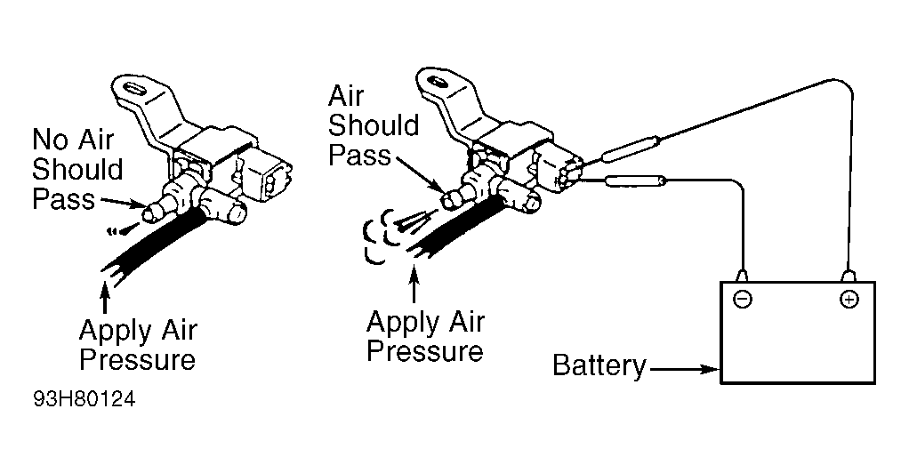3. Ensure no continuity exists between each electrical terminal and A/C idle-up VSV body. Test A/C idle-up VSV by applying air pressure to designated area and checking air passage, and then applying battery voltage and ground and retesting. See Fig 1. Replace A/C idle-up VSV if defective.