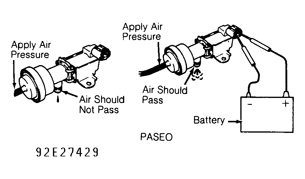Application Ohms Paseo 30-33 - Ensure no continuity exists between each electrical terminal and air control valve body. Test air control valve by applying air pressure to designated area and checking air passage, and then applying battery voltage and ground and retesting. See Fig 1. Replace air control valve if defective or continuity exists between electrical terminals and air control valve body.