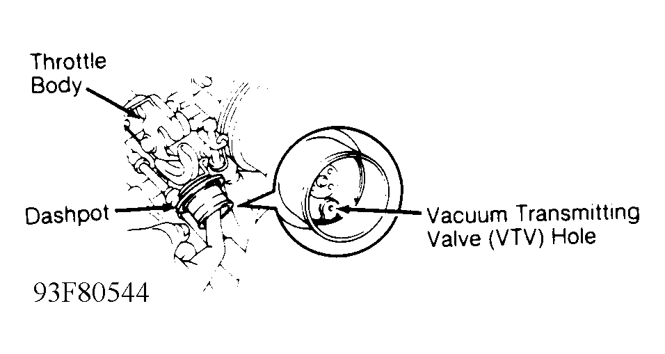 2. Start engine. Maintain engine speed at specified testing RPM. See DASHPOT TESTING SPECIFICATIONS  table. Plug Vacuum Transmitting Valve (VTV) hole with your finger. See Fig 2.