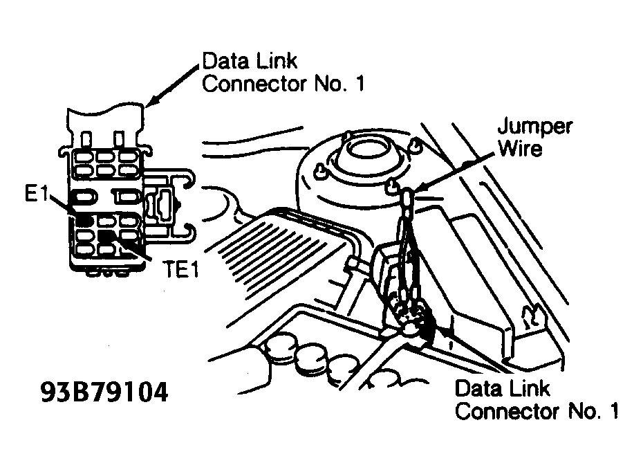 6. Turn ignition on with engine off. Install Jumper Wire (SST 09843-18020) between terminals "T" (Tercel) or TE1 (all others) and E1 in Data Link Connector (DLC). See Figure.