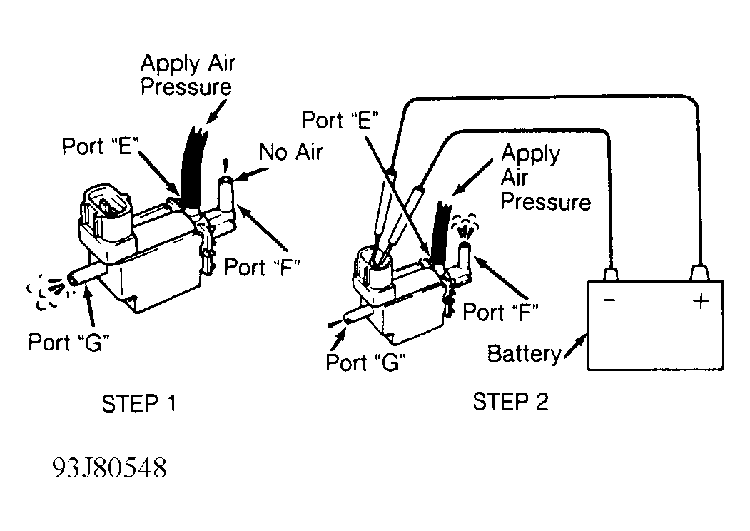 - Connect battery voltage and ground to VSV terminals. Apply air pressure to port "E". Ensure air passes out port "F" and not port "G" . Perform STEP 2. See Fig 2. Replace VSV if defective.