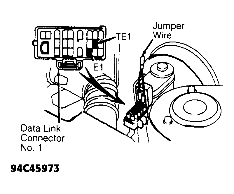 - Install Jumper Wire (SST 09843-18020) between terminals TE1 and E1 of data link connector No. 1, located in engine compartment. See Figure.NOTE: The EGR system components can be checked with engine coolant temperature less than minimum temperature and engine at specified engine RPM.