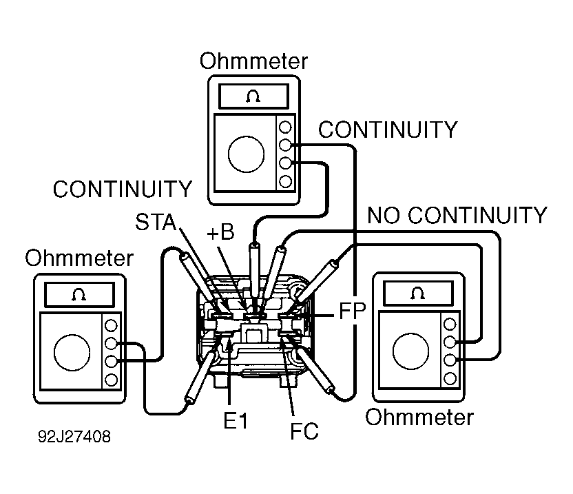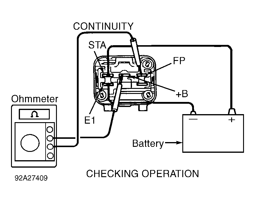 - Check circuit opening relay operation by applying battery voltage and ground and checking continuity between specified terminals. See Fig 1 and Fig 2. Replace circuit opening relay if defective.