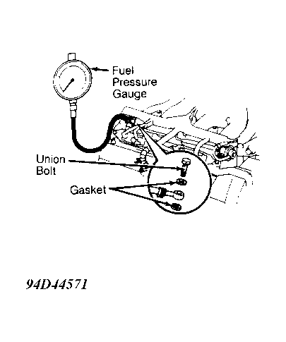 11. Disconnect negative battery cable. Remove fuel pressure gauge. Reinstall union bolt using NEW gaskets. Tighten union bolt. Install cold start injector electrical connector (if equipped). Install negative battery cable.