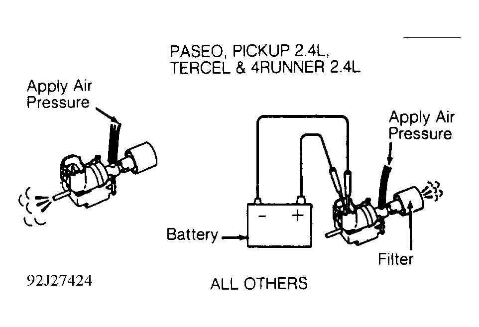 - Check fuel pressure control VSV operation by applying air pressure to designated area and checking air passage, and then applying battery voltage and ground and retesting. See Fig 1. Replace fuel pressure control VSV if defective.