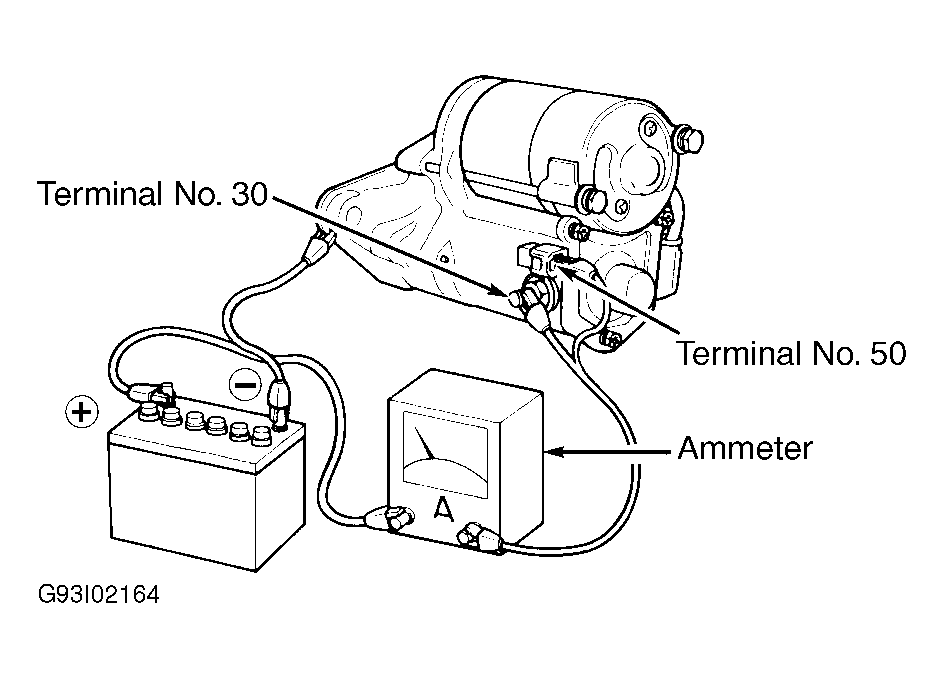 - Remove starter. Connect ammeter in series between starter motor terminal No. 30 (battery terminal) and a fully charged 12-volt battery. Connect battery negative to starter case ground. See Fig 1 or Fig 2