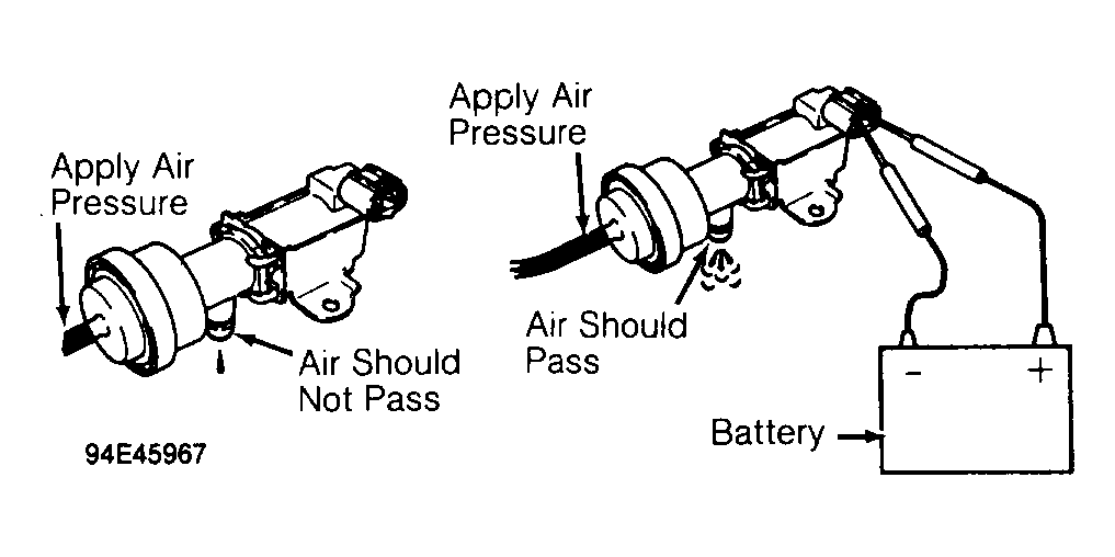 - Ensure no continuity exists between each electrical terminal and air control valve body. Test air control valve operation by applying air pressure to designated area and checking air passage, and then applying battery voltage and ground and retesting. See Fig 1. Replace air control valve if defective or continuity exists between electrical terminals and air control valve body.