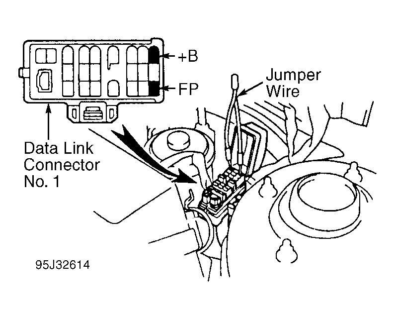 - Install Jumper Wire (SST 09843-18020) between +B and FP terminals of data link connector No. 1. See Fig 1.NOTE: Data link connector No. 1 is located in engine compartment.
