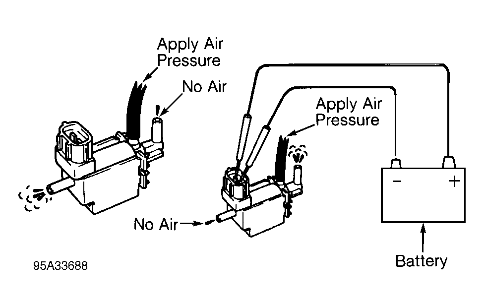 - Check fuel pressure control VSV operation by applying air pressure to designated area and checking air passage, and then applying battery voltage and ground and retesting. See Fig 1. Replace fuel pressure control VSV if defective.