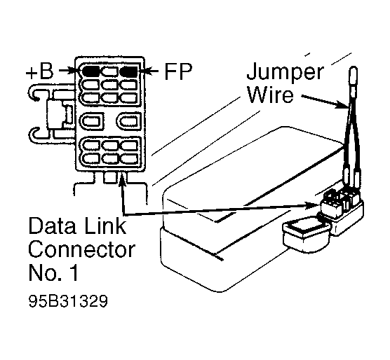 - Install Jumper Wire (SST 09843-18020) between +B and FP terminals of data link connector No. 1. See Fig 1.NOTE: Data link connector No. 1 is located in engine compartment.