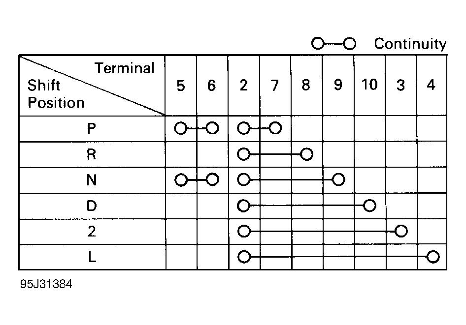 - Disconnect PNP switch harness connector. PNP switch is located at transmission where shifter select cable is mounted. Using ohmmeter, check continuity of switch terminals in specified positions. See Fig 1 and Fig 2. Replace as needed.