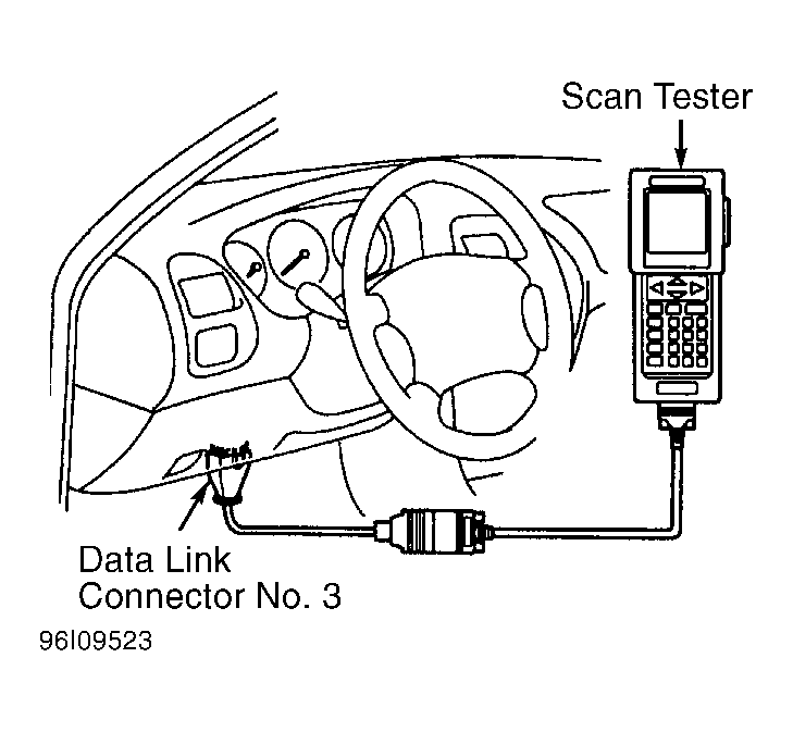 1. Remove cover (if equipped) and install scan tester on data link connector No. 3. See Figure. Turn ignition on. DO NOT start engine.