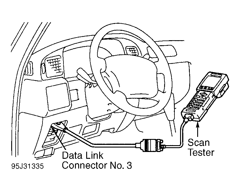 1. Remove cover (if equipped) and install scan tester on data link connector No. 3. See Figure. Turn ignition on. DO NOT start engine.