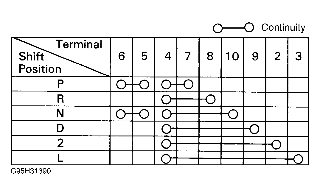 - Disconnect PNP switch connector. PNP switch is located at transmission where shifter select cable is mounted. Using ohmmeter, check continuity of switch terminals in specified positions. See Fig 1 and Fig 2. Replace switch as necessary.