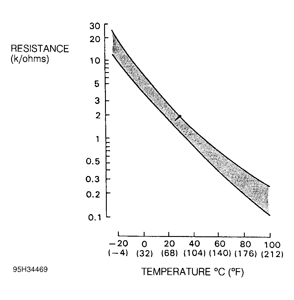 For engine coolant temperature sensor location, see information in appropriate SYSTEM/COMPONENT TESTS article. Using ohmmeter, check resistance between electrical terminals on engine coolant temperature sensor. Ensure resistance is within specification in relation to specified temperature. See Fig 1.