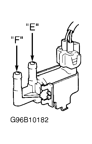 2. With jumper wire connected, Vacuum Switching Valve (VSV) is on. Air from port "E" should exhaust from port "F". See Figure. Disconnect jumper wire. Air from port "E" should not exhaust from port "F". If valve operates as specified, go to step 6). If valve does not operate as specified, go to next step.