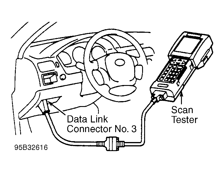 1. Remove cover (if equipped) and install scan tester on data link connector No. 3. See Figure. Turn ignition on. DO NOT start engine.