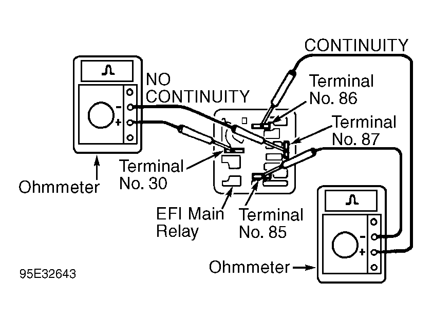 - To test EFI main relay operation, apply battery voltage and ground to relay and use ohmmeter to check continuity between specified terminals. See Fig 1 and Fig 2. Replace EFI main relay if defective.