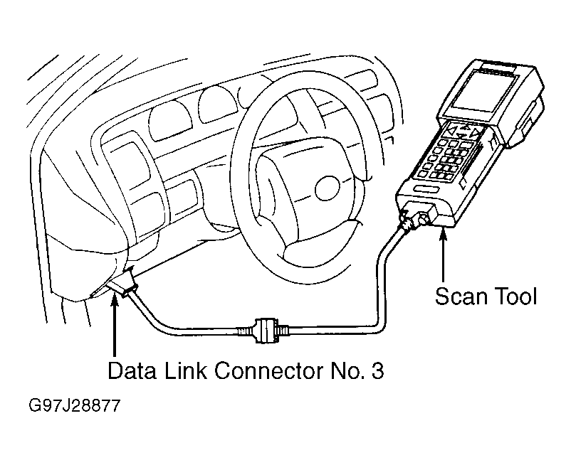 1. Remove cover (if equipped) and connect scan tool to data link connector No. 3. See Fig 1. Turn ignition on. DO NOT  start engine.