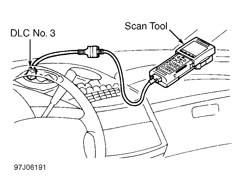 1. Connect scan tool to Data Link Connector (DLC) No. 3. See Figure. Turn ignition on with engine off. Turn scan tool on. Using scan tool manufacturer's instructions, check for DTCs and freeze-frame data.