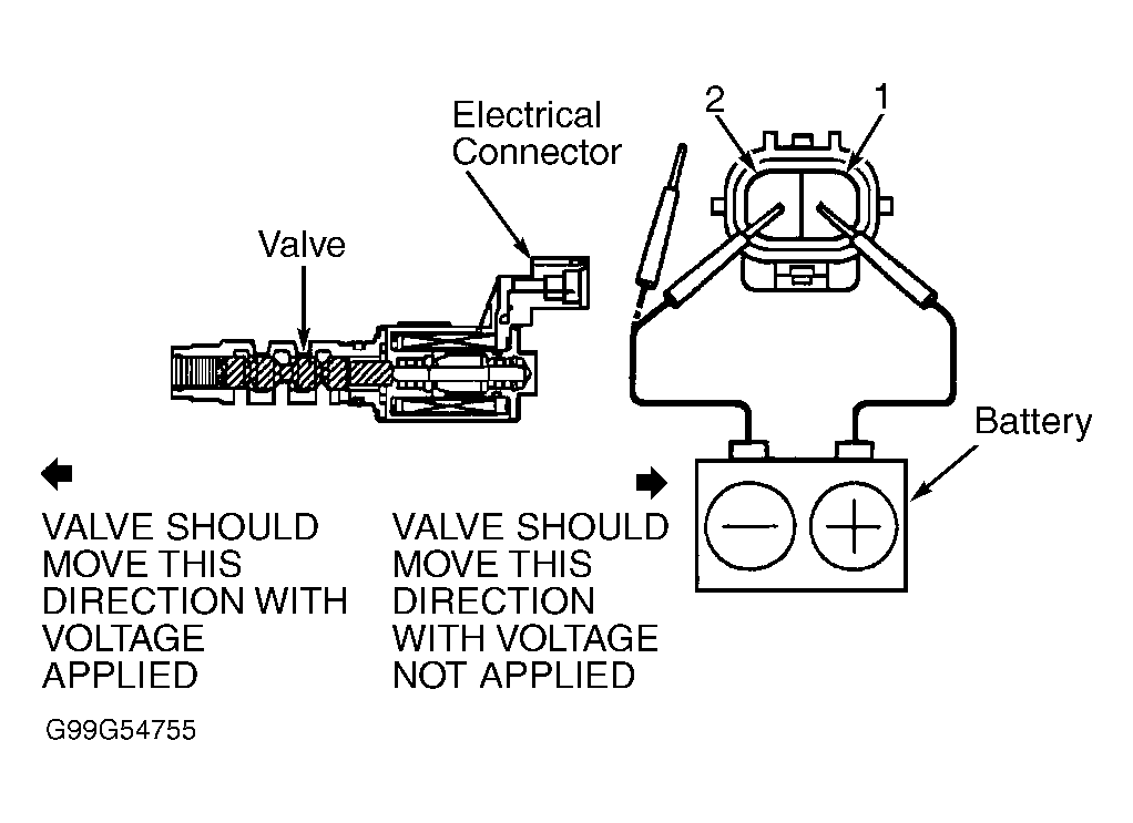 - With VVT OCV removed, connect a fused jumper wire between positive battery terminal and terminal No. 1 at VVT OCV. See Figure. Connect another jumper wire between negative battery terminal and terminal No. 2 at VVT OCV and note VVT OCV plunger operation. With battery voltage applied, plunger on end of VVT OCV should extend. Disconnect a jumper wire. Without battery voltage applied, plunger should retract. If VVT OCV operates as specified, go to next step. If VVT OCV does not operate as specified, replace VVT OCV and go to next step.