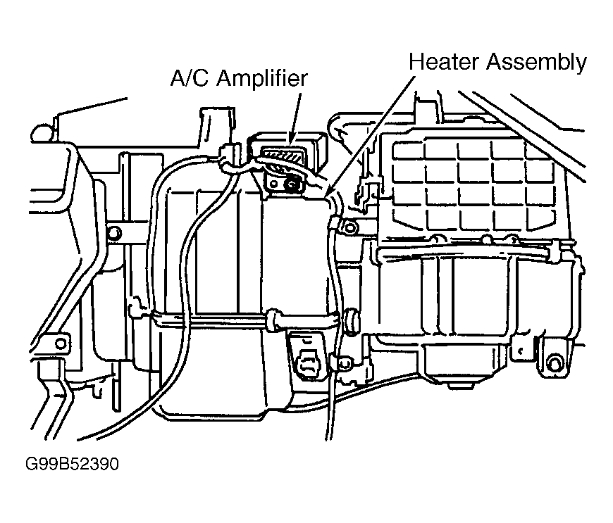 12. Check for open or short in wiring harness and electrical connectors between ECM and A/C amplifier. See WIRING DIAGRAMS in RAV4 article in MANUAL A/C-HEATER SYSTEMS. A/C amplifier is located behind instrument panel, just above glove box, on top of heater assembly. See Fig 1. If wiring harness and electrical connectors are okay, replace A/C amplifier. If wiring harness or electrical connector is defective, repair as necessary.