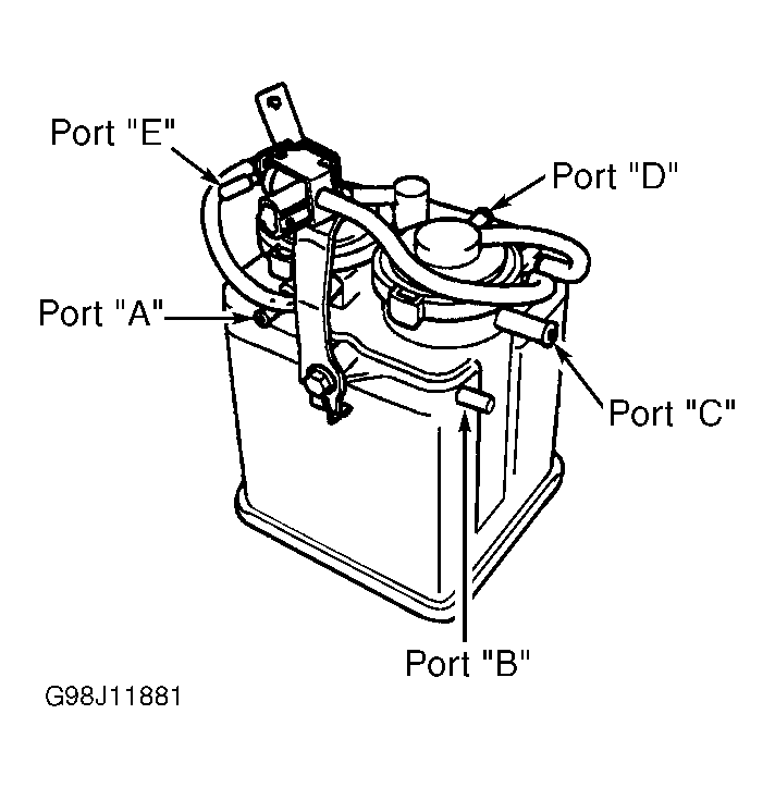 12. Install plug on port "E" on charcoal canister. See Fig 2. Apply.26 psi (.018 kg/cm2 ) air pressure to port "A" while holding port "B" closed. See Fig 2. Ensure air flows freely from port "D".