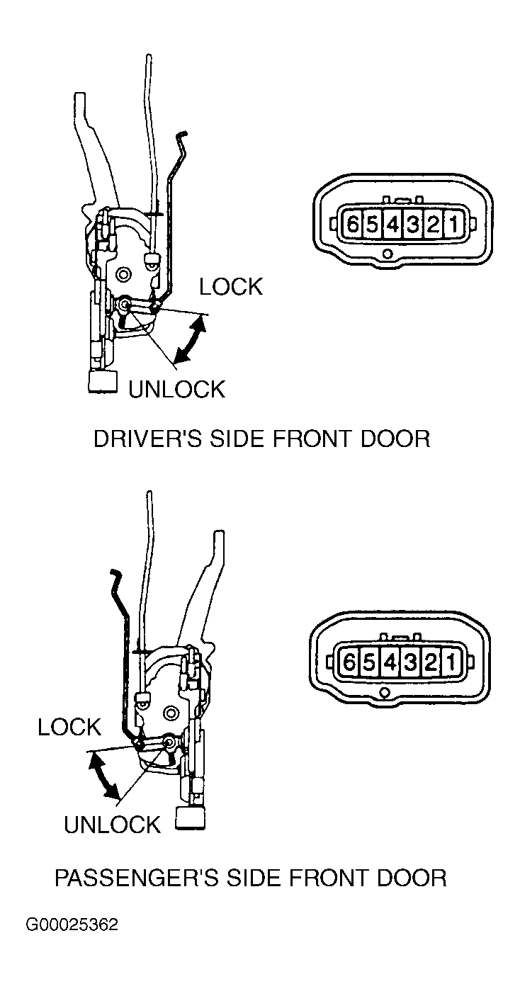 - Disconnect the 6-pin electrical connector at door lock assembly. Note electrical terminal identification on door lock assembly and switch positions. See Fig 1.