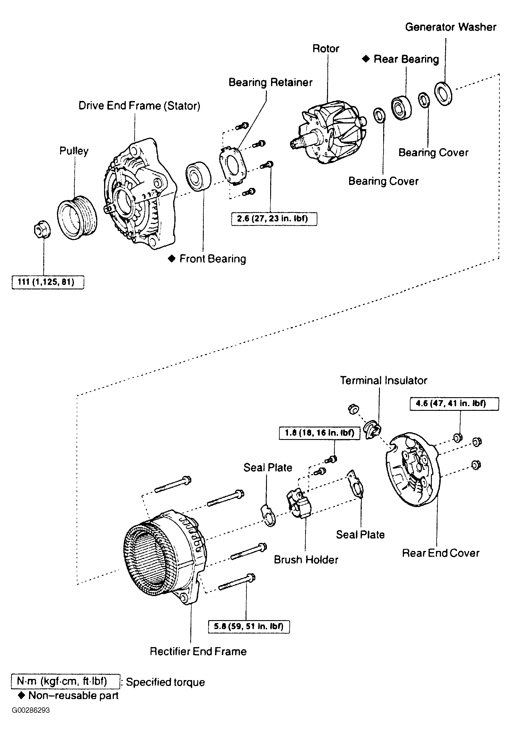 1. Remove rear end cover. Remove nut and terminal insulator. Remove rear seal plate from brush holder. Remove brush holder. See Fig 1. Remove front seal plate from coil. Use generator Pulley Set Nut Wrench Set (SST 09820-63010) to remove generator pulley.