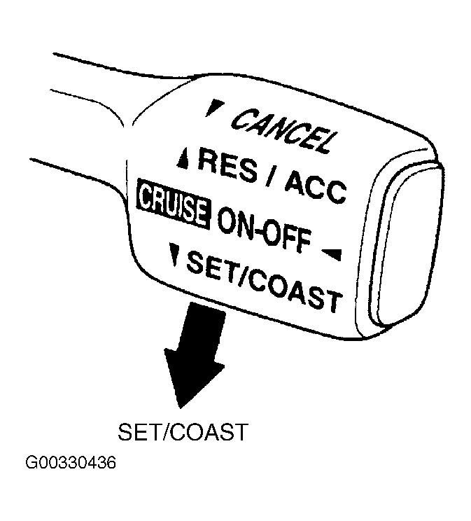 Push the lever down in the "SET/COAST " direction and hold it. See Figure. Release the lever when the desired speed is attained. While the lever is held down, the vehicle speed will gradually decrease.