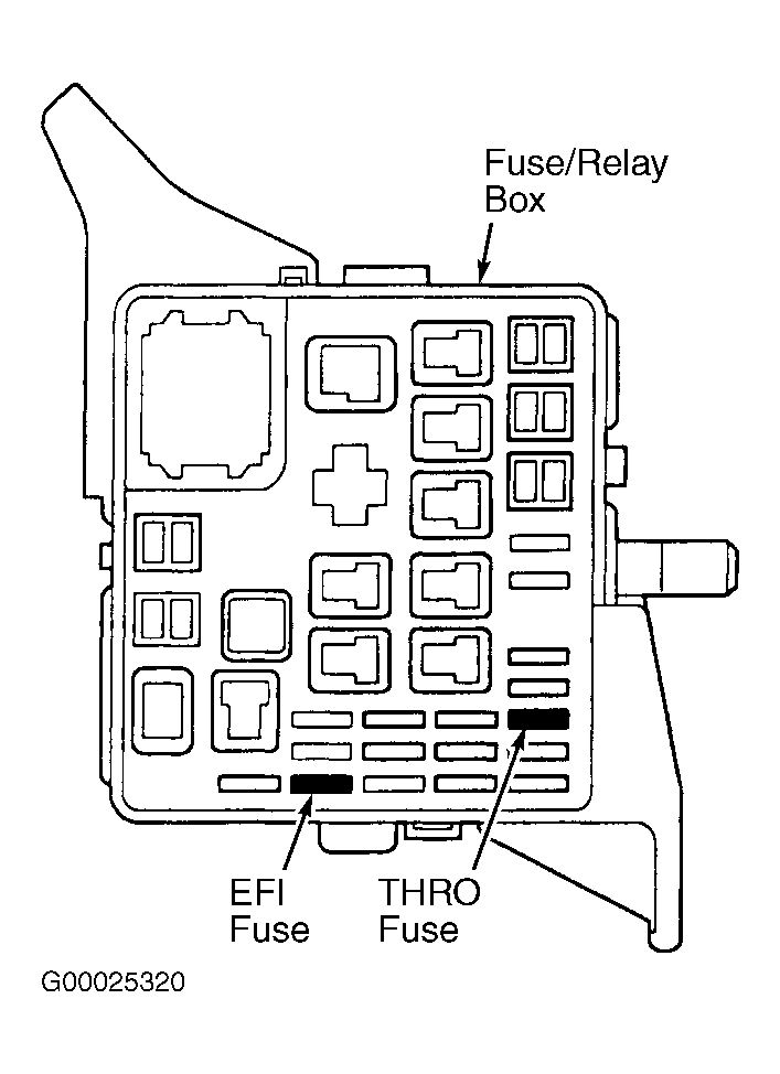 - Remove EFI fuse (15-amp) from fuse/relay box at driver's side front corner of engine compartment. See Figure. Check EFI fuse. If EFI fuse is okay, reinstall EFI fuse. Check wiring harness and electrical connectors between EFI fuse and ECM. See WIRING DIAGRAMS article. It may be necessary to check wiring between battery and EFI fuse. For additional wiring for EFI fuse to the battery, see POWER DISTRIBUTION article in WIRING DIAGRAMS. If EFI fuse is defective, replace fuse and check for short in wiring harness and components connected to EFI fuse. See WIRING DIAGRAMS article. Repair wiring harness or electrical connectors as necessary.