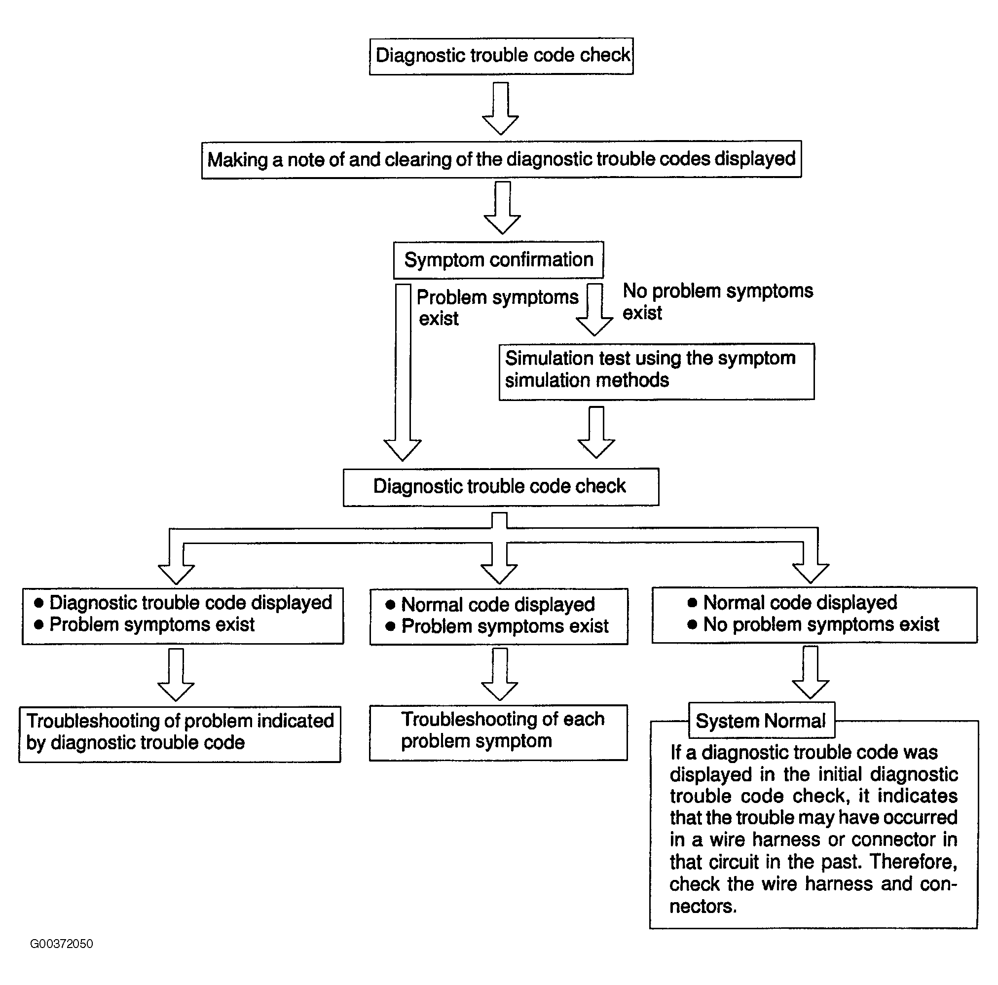 Taking into account the points in Fig 1, a flow chart showing how to proceed with troubleshooting using the diagnostic trouble code check is shown in Fig 2. This flowchart shows how to utilize the diagnostic trouble code check effectively, then by carefully checking the results, indicates how to proceed either to diagnostic trouble code troubleshooting or to troubleshooting of problem symptoms table.
