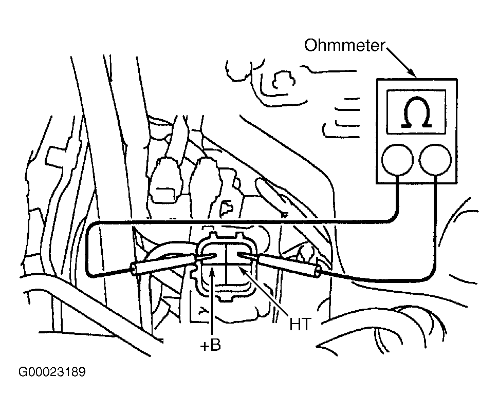 - Disconnect electrical connector for heated oxygen sensor (bank No. 2 sensor No. 2) located on exhaust manifold below catalytic converter. See Figure. Using ohmmeter, check resistance between +B and HT terminals on electrical connector for heater on heated oxygen sensor (bank No. 2 sensor No. 2). See Figure. Resistance should be 11-16 ohms at 68°F (20°C) and 23-32 ohms at 1472°F (800°C). If resistance is within specification, replace catalytic converters along with exhaust manifold. If resistance is not within specification, replace heated oxygen sensor (bank No. 2 sensor No. 2). See HEATED OXYGEN SENSOR under ENGINE SENSORS & SWITCHES in REMOVAL, OVERHAUL & INSTALLATION - 4-CYLINDER article.