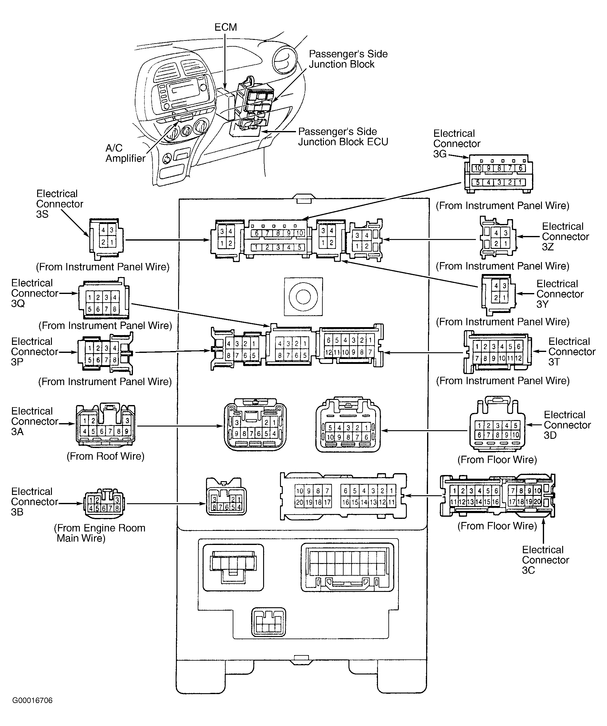 Fig 1: Locating Passenger's Side Junction Block Electronic Control Unit, A/C Amplifier & Identifying Electrical Connectors (RAV4)
