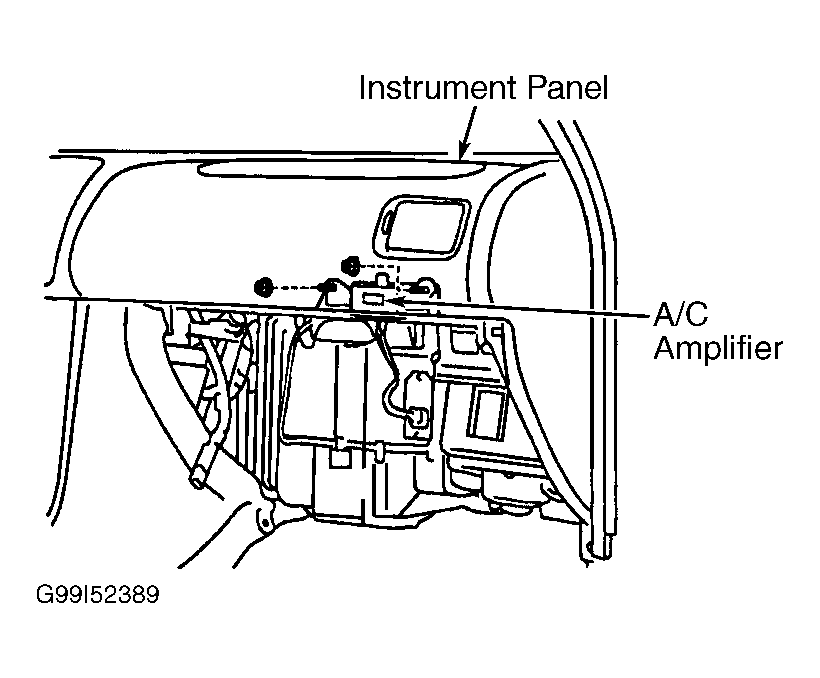 14. Check for open and short in wiring harness and electrical connectors between ECM and A/C amplifier. See WIRING DIAGRAMS in appropriate article in AIR CONDITIONING & HEATING. A/C amplifier is located behind instrument panel, just above glove box, near center of glove box area. See Fig 1. If wiring harness and electrical connectors are okay, replace A/C amplifier. If wiring harness or electrical connector is defective, repair as necessary.