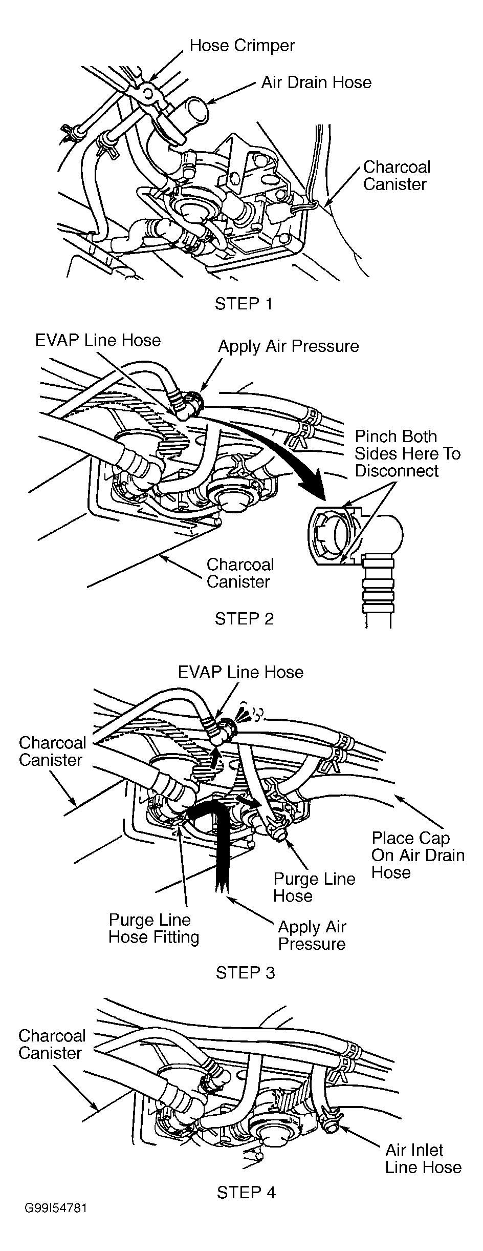 10. Install hose crimper on air drain hose near charcoal canister. Charcoal canister is located near fuel tank. See Figure. Perform STEP 1 in illustration. See Fig 1. Go to next step.