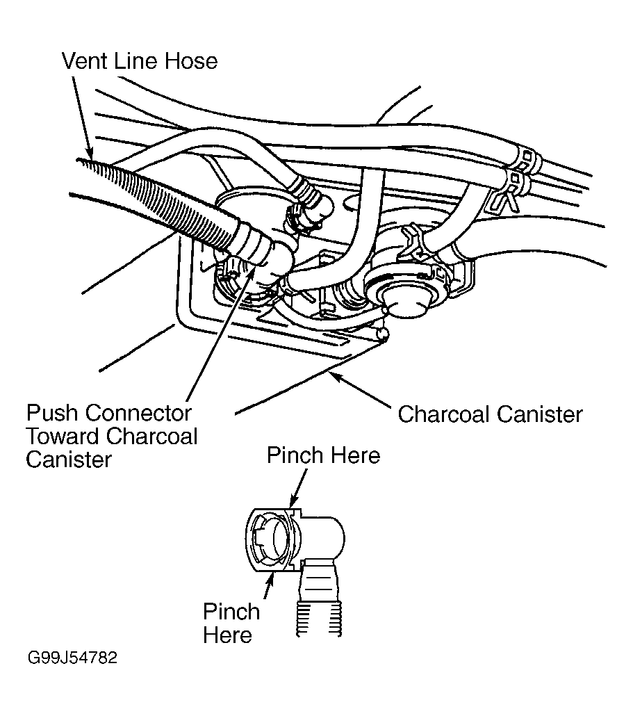 22. Push connector on vent line hose toward charcoal canister, pinch both sides of retainer on connector, and disconnect vent line hose with connector from charcoal canister. See Fig 2.