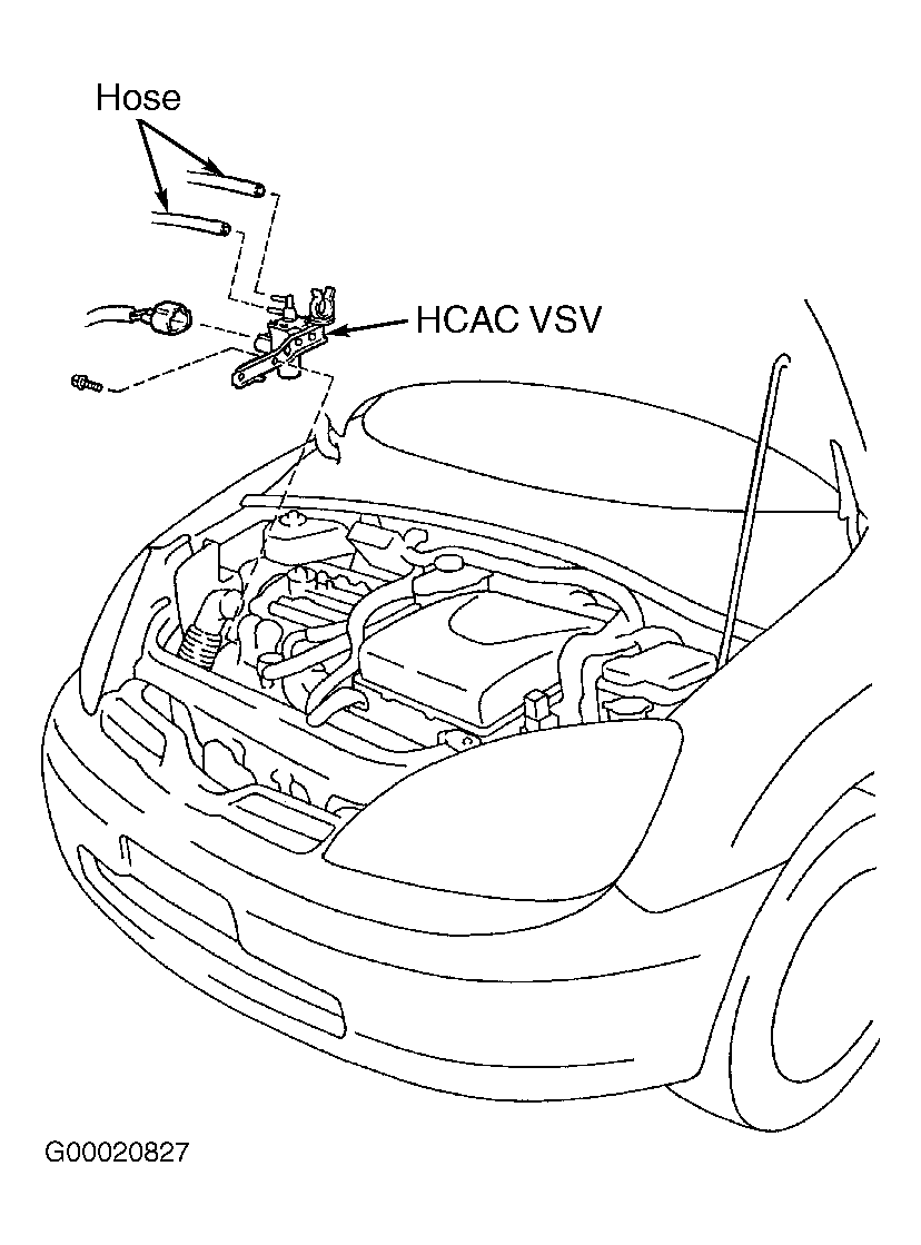 5. Check vacuum hose and line to HCAC VSV. If vacuum hose and line are okay, check operation of actuator for HCAC system and HCAC VSV. See ACTUATOR FOR HCAC SYSTEM & BY-PASS VALVE  and HCAC VACUUM SWITCHING VALVE . If vacuum hose or line are defective, replace components as necessary and recheck system operation.