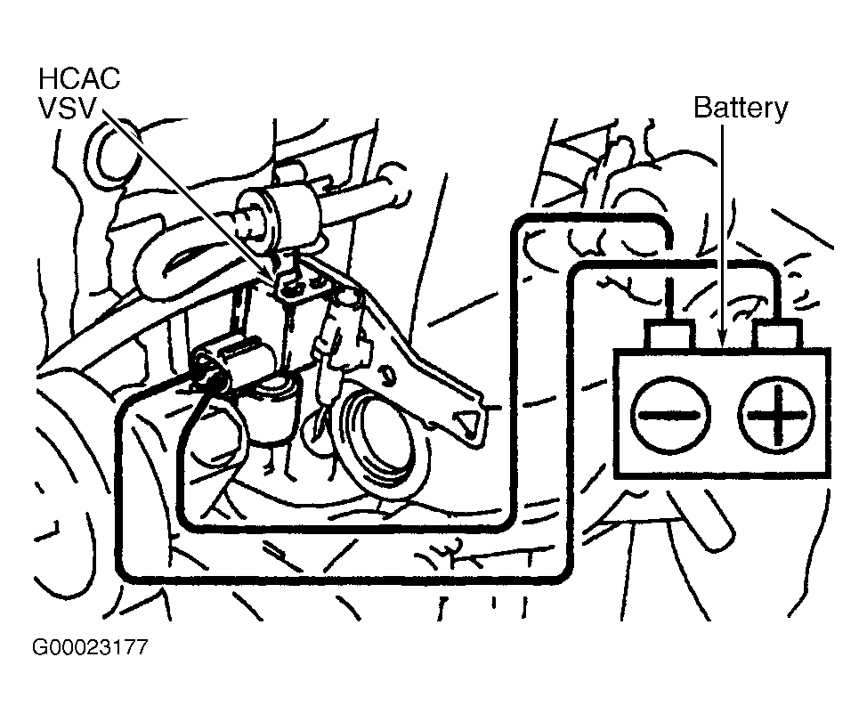 3. Disconnect electrical connector at HCAC Vacuum Switching Valve (VSV). See Fig 1. HCAC VSV is located on bracket bolted to timing chain end of engine and uses a Brown 2-pin electrical connector with Black and Black/White wires. Apply battery voltage and ground to electrical terminals on HCAC VSV to operate HCAC VSV. See Fig 2. Start engine. Go to next step.