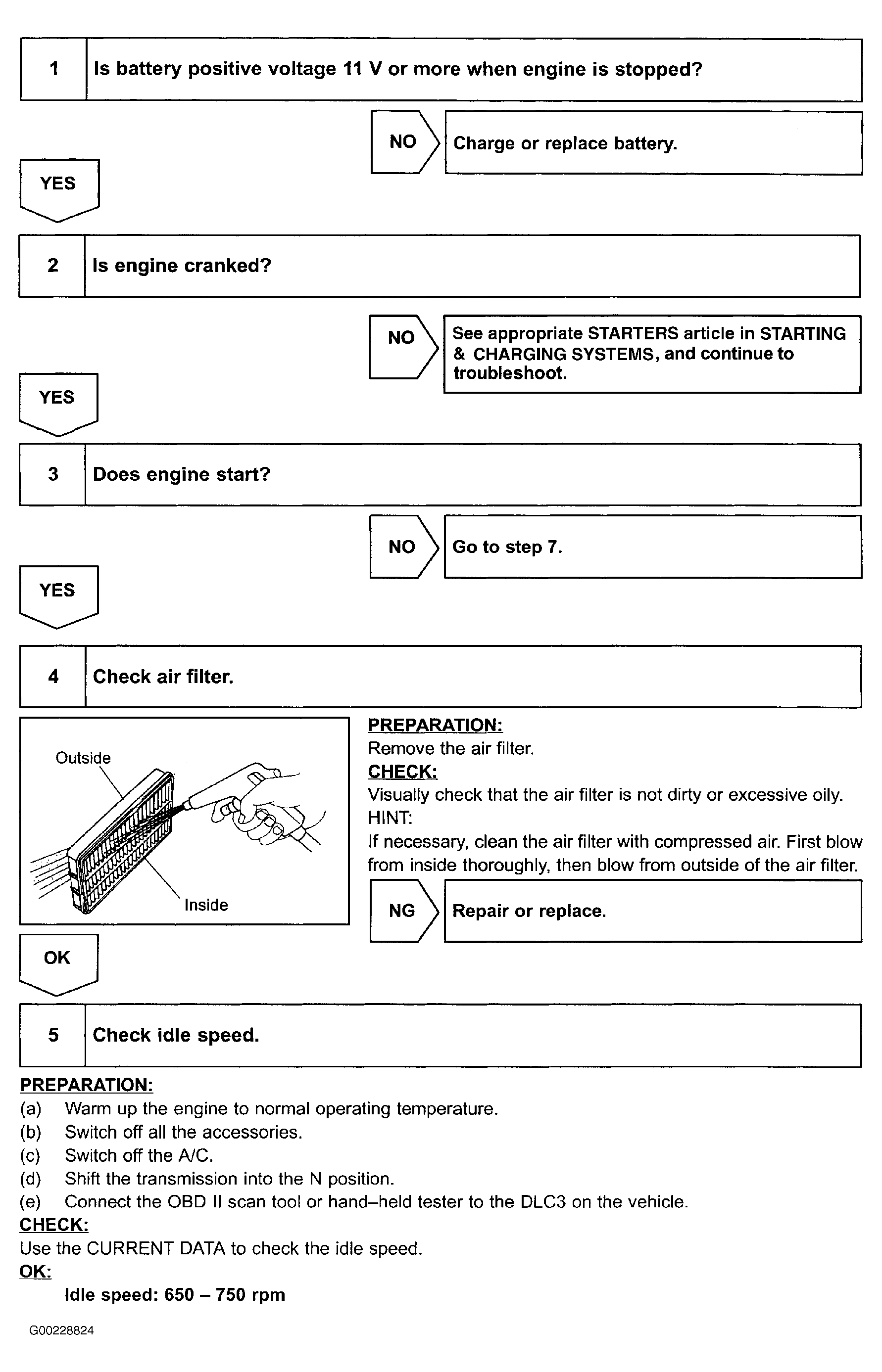 When the malfunction code is not confirmed in the DTC check, trouble shooting should be performed in order for all possible circuits to be considered as the cause of the problems. In many cases, by carrying out the basic engine check shown in the following flowchart, the location causing the problem can be found quickly and efficiently. Therefore, use of this check is essential in engine trouble shooting. See Fig 1-Fig 3 .